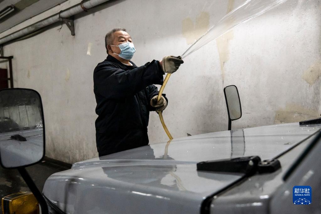 在南昌火車(chē)站,牽引車(chē)司機張細茂在清洗牽引車(chē)(2月1日攝)。