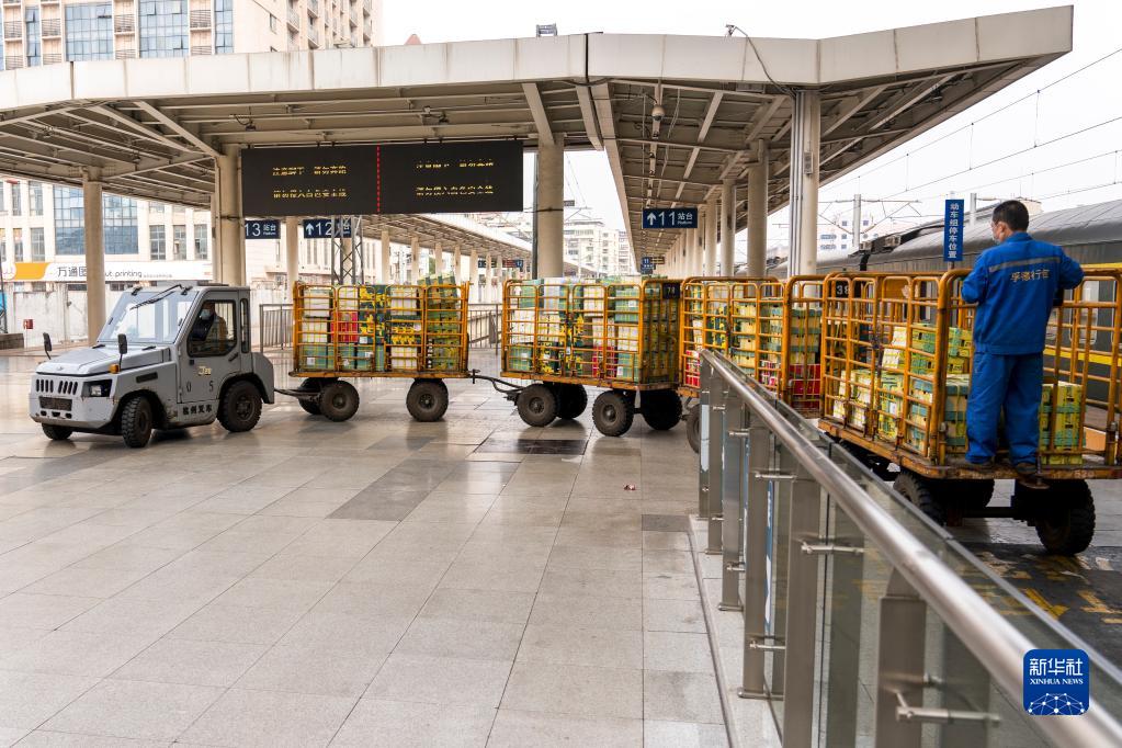 在南昌火車(chē)站站臺,張細茂駕駛牽引車(chē)運送行李包裹(2月1日攝)。