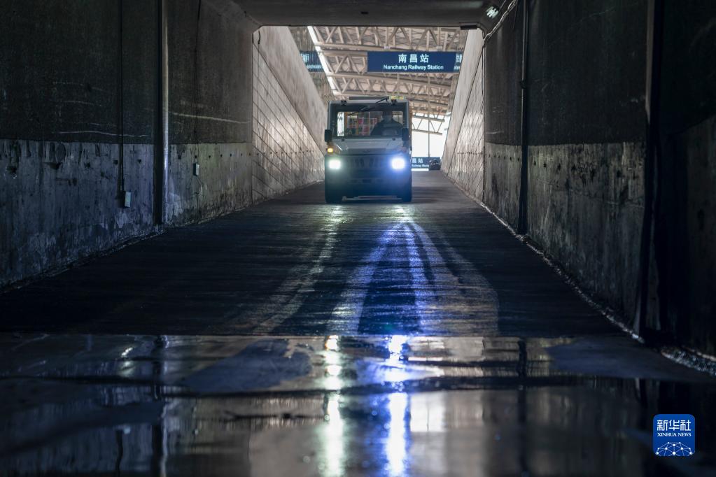 在南昌火車(chē)站地下通道,張細茂駕駛牽引車(chē)運送行李包裹(2月1日攝)。
