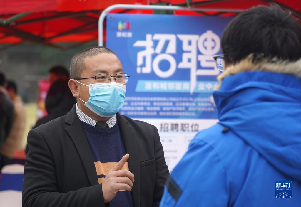 2月1日,招聘企業(yè)代表(左)在招聘會(huì )上與求職者交流。