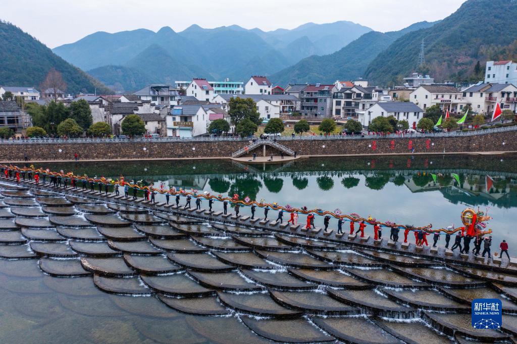 2月1日,窈口村女子板龍隊在湖源鄉的龍鱗壩碇步橋上進(jìn)行舞龍表演(無(wú)人機照片)。