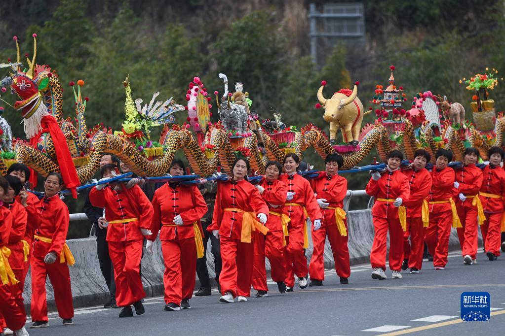 當日是農歷正月十一,在梅花鑼鼓的伴奏下,浙江省杭州市富陽(yáng)區湖源鄉窈口村女子板龍隊舉起由50余張板凳連起來(lái)的百米板龍舞動(dòng)起來(lái),拉開(kāi)了湖源鄉新春系列迎元宵活動(dòng)的序幕。
