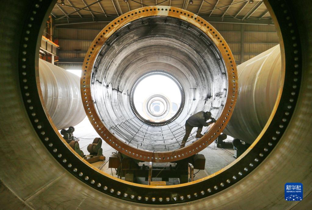 2月1日,江蘇連云港經(jīng)濟技術(shù)開(kāi)發(fā)區一風(fēng)力設備制造企業(yè)車(chē)間,工人在趕制風(fēng)電塔架。
