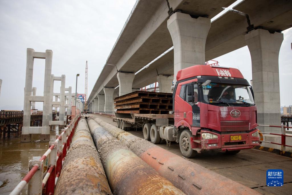 2月1日,裝載施工材料的貨車(chē)行駛在杭甬高速復線(xiàn)一期工程現場(chǎng)。