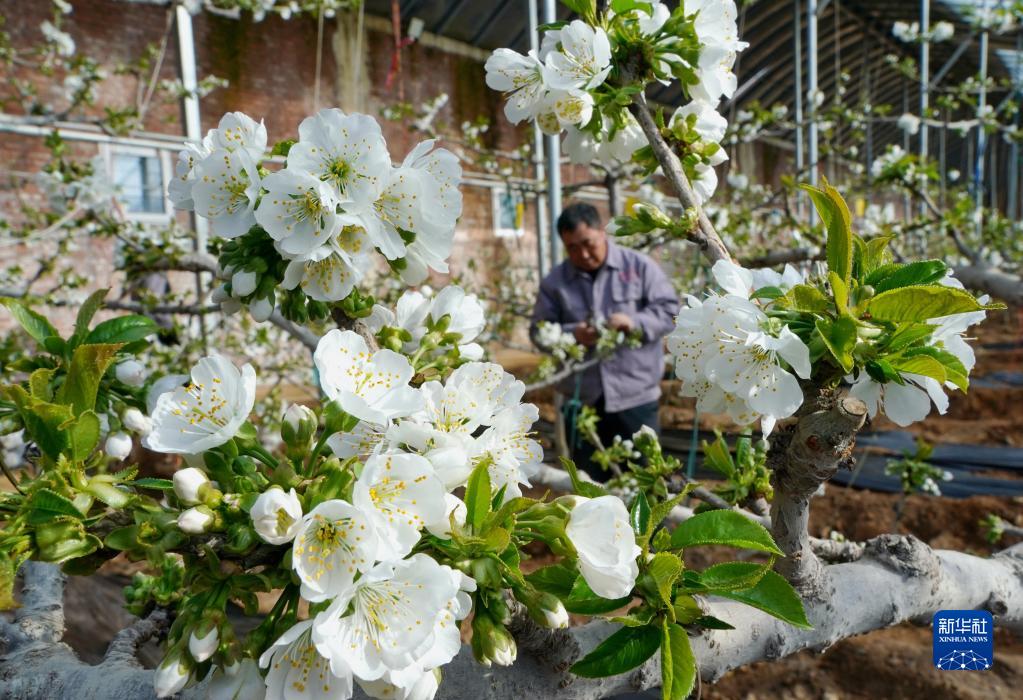 2月1日,秦皇島市撫寧區榆關(guān)鎮一家櫻桃種植合作社的社員在大棚內管護櫻桃樹(shù)。
