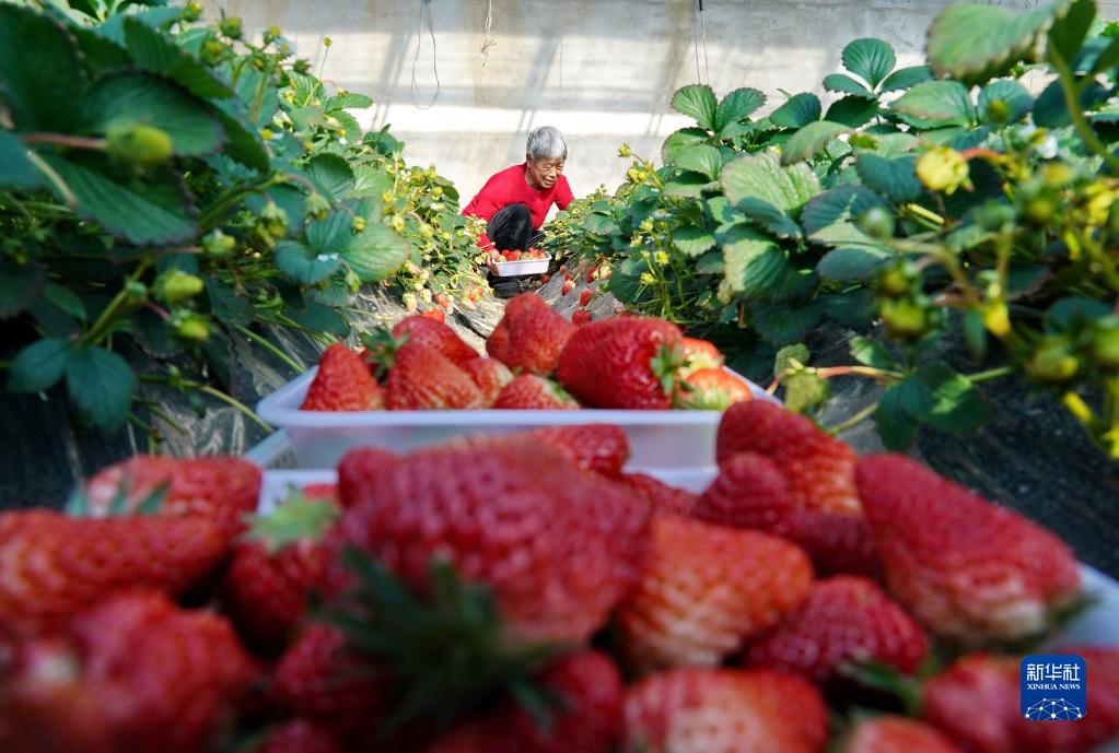 2月1日,秦皇島市撫寧區榆關(guān)鎮農民在大棚內采摘草莓。