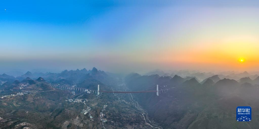 當日,貴州壩陵河大橋沐浴在夕陽(yáng)余暉下,美不勝收。