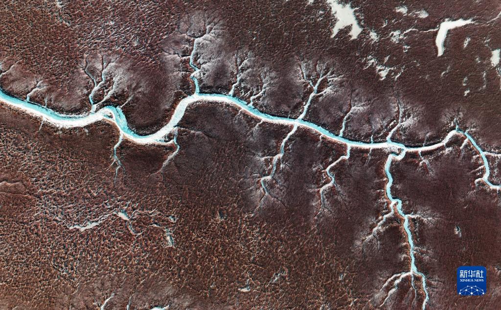 近日,在遼寧盤(pán)錦遼河口濕地,海水在潮汐作用下涌入遼河口濕地的潮溝,并凝結成冰,從高空看去,宛若蜿蜒曲折、形態(tài)各異的“冰脈”。