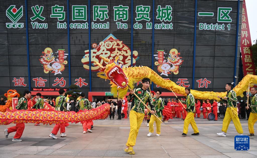 2月2日,舞龍隊在義烏國際商貿城門(mén)口的廣場(chǎng)表演。