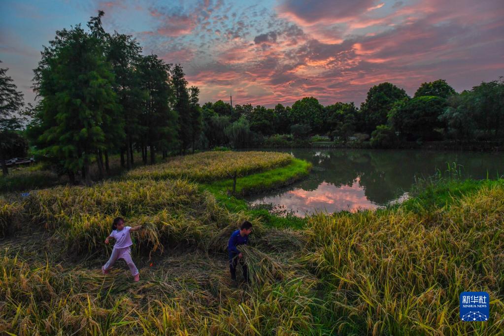 孩子在廣州海珠濕地水稻田體驗收割勞作(2020年7月25日攝)。