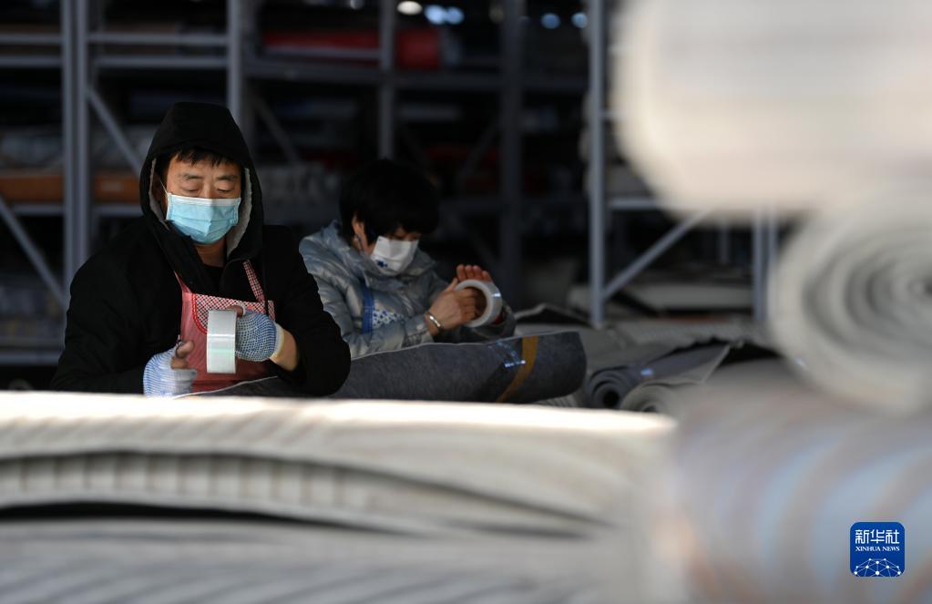 在天津市武清區崔黃口鎮凱利地毯有限公司,工人打包地毯(2月1日攝)。