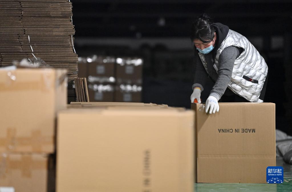 在天津市武清區崔黃口鎮安芝金林地毯有限公司,工人整理包裝箱(2月1日攝)。