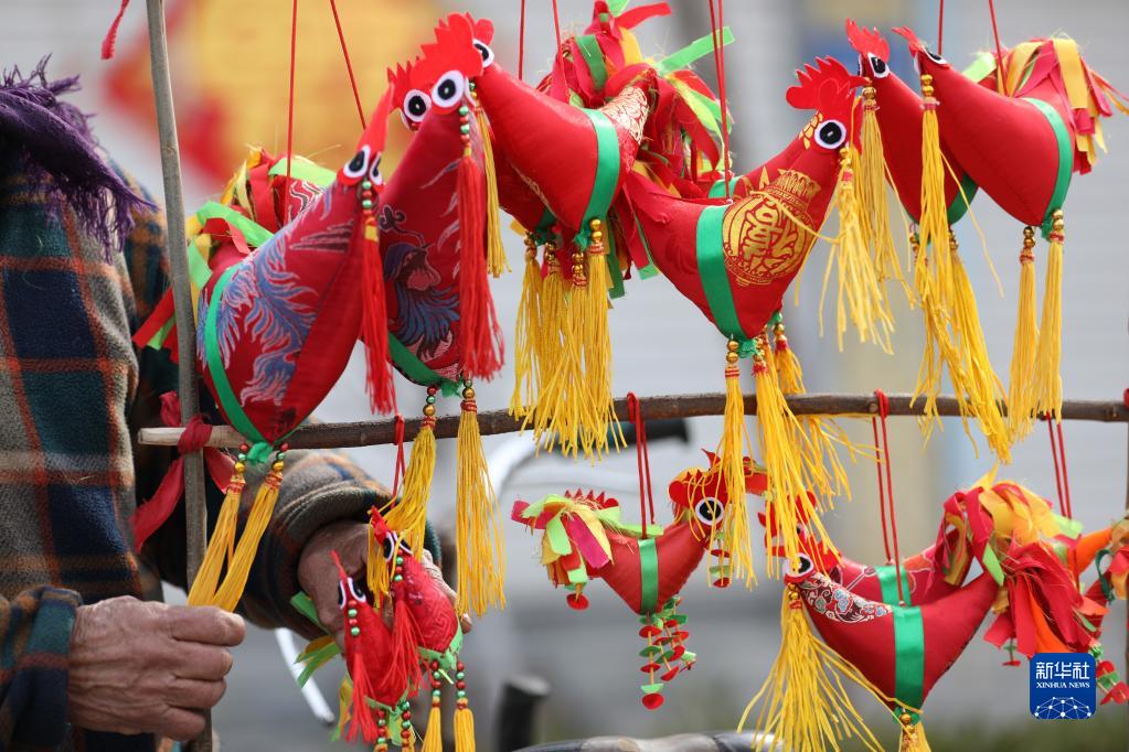 2月2日,一名民間手工藝人在山東省臨沂市郯城縣郯城街道集市上售賣(mài)自己縫制的“春雞”。