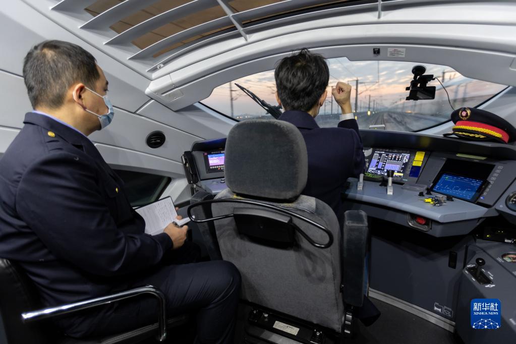2月1日早晨6時(shí)30分許,上海機輛段司機陳逸東駕駛DJ7715次高鐵確認列車(chē)行駛在工作路段,上海高鐵基礎設施段隨車(chē)添乘班班長(cháng)陳曉華(左)在一旁觀(guān)察和記錄道路基礎設施情況。此時(shí)窗外天剛蒙蒙亮。