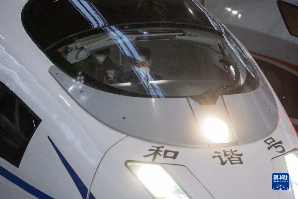 2月1日早晨6時(shí)40分許,DJ7715次高鐵確認列車(chē)完成既定線(xiàn)路任務(wù)后返回上海站,上海機輛段司機陳逸東(右)和上海動(dòng)車(chē)段隨車(chē)機械師吳家樂(lè )(左)在司機室交接。