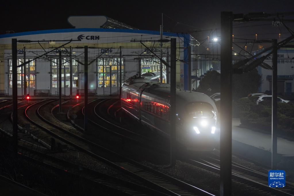 2月1日凌晨3時(shí)許,DJ7716次高鐵確認列車(chē)在完成庫內檢修和清洗作業(yè)后,從南翔動(dòng)車(chē)運用所庫內緩緩駛出,準備前往存車(chē)線(xiàn)進(jìn)行發(fā)車(chē)準備。
