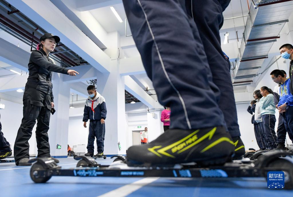 在烏魯木齊第54中學(xué),許秀娟(左一)為學(xué)生講授越野滑輪的技巧(2021年11月16日攝)。