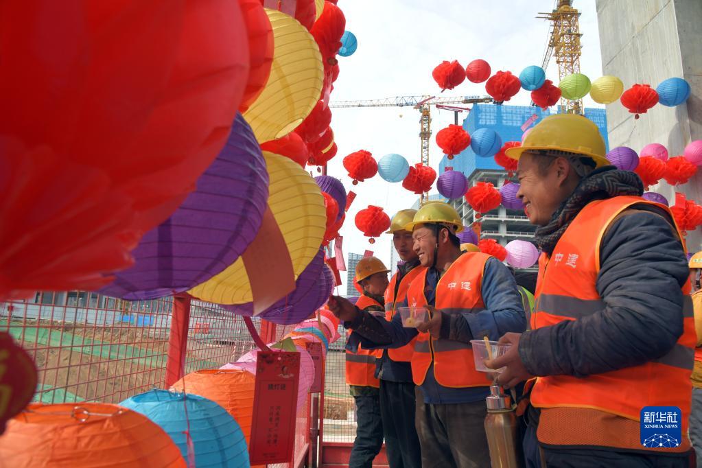 2月2日,施工人員在山東濟南國際金融城北區項目現場(chǎng)猜燈謎。