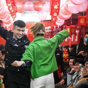 2月1日晚,在“中國雪都·阿勒泰號”冰雪旅游專(zhuān)列上,乘警支隊民警尼加提·買(mǎi)買(mǎi)提與旅客一起跳起麥西來(lái)甫。