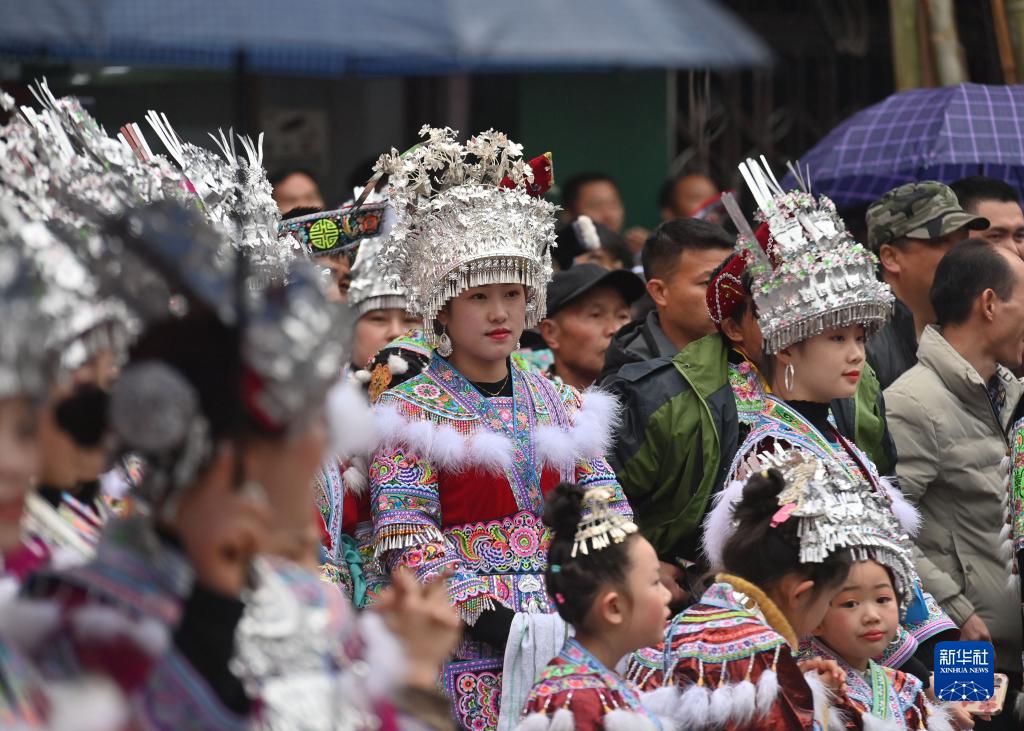 2月2日,融水苗族自治縣桿洞鄉苗族姑娘在觀(guān)看民俗表演。