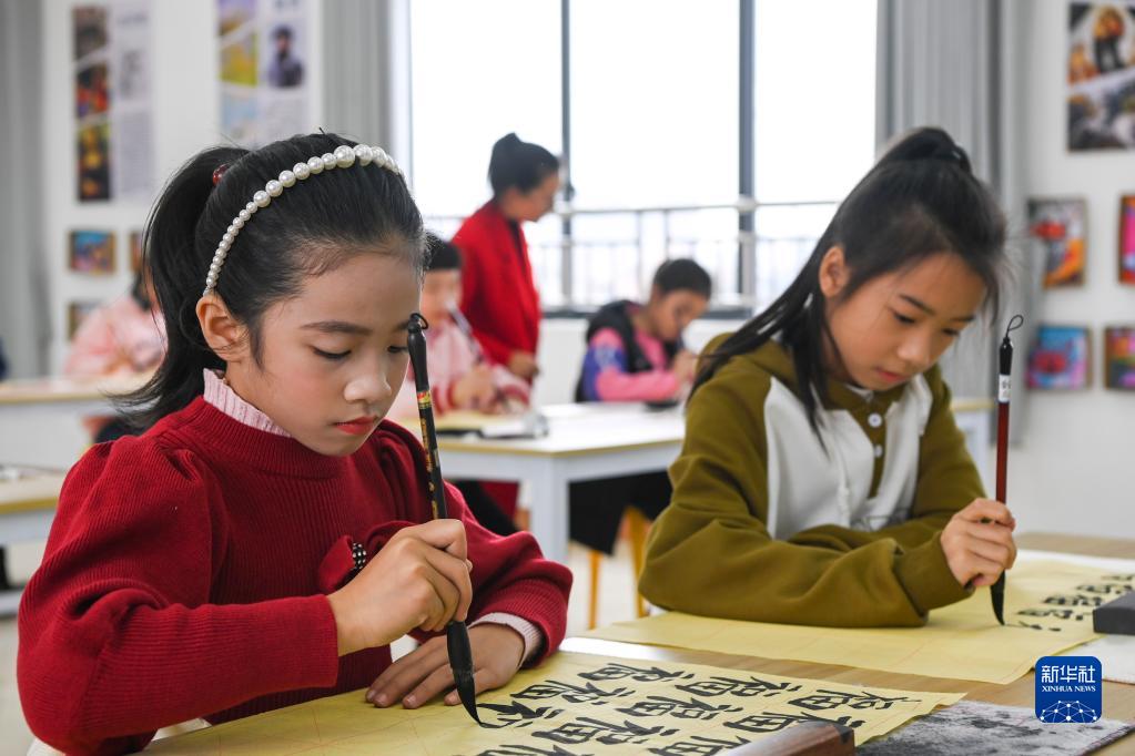 2月2日,在廣西興業(yè)縣至德小學(xué),學(xué)生們在練習書(shū)法。