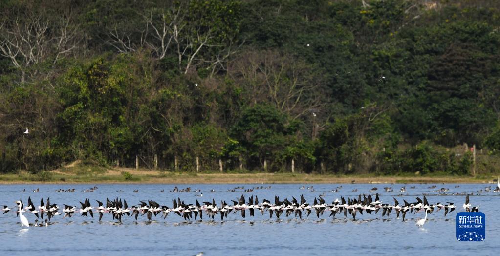 一群黑翅長(cháng)腳鷸在海南東寨港國家級自然保護區內飛翔(1月30日攝)。