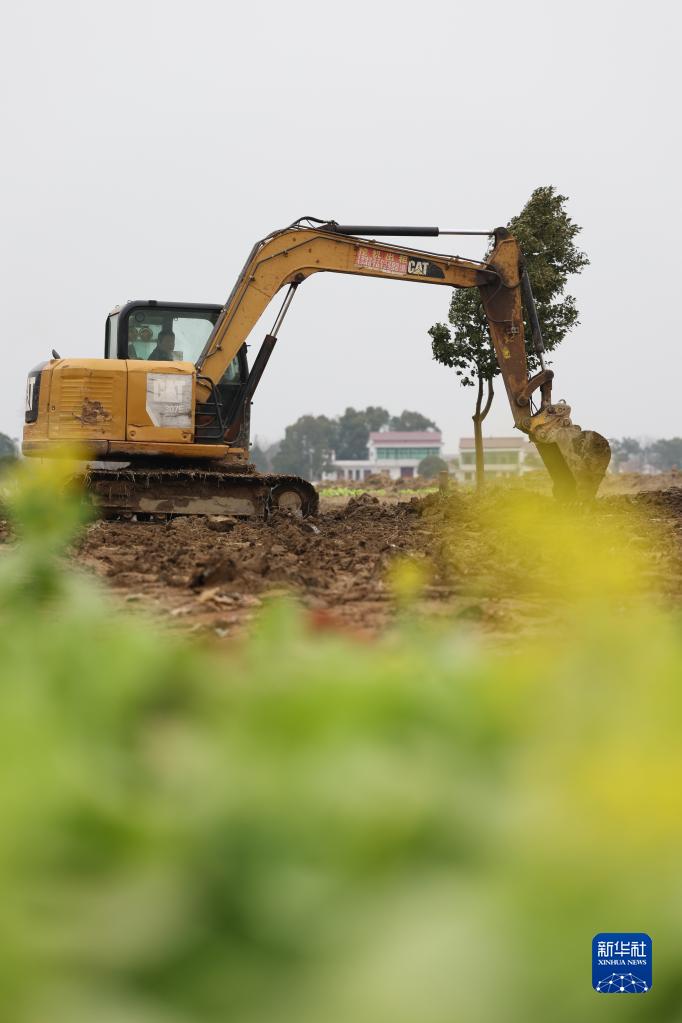 2月2日,工人在湖南省益陽(yáng)市赫山區筆架山鄉中塘村高標準農田建設現場(chǎng)平整土地。