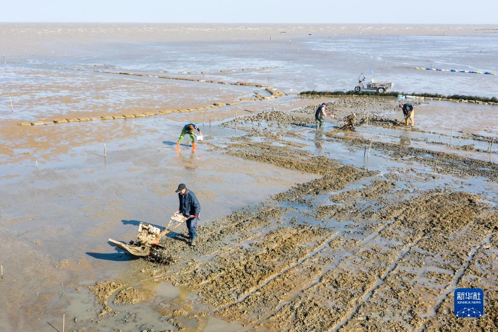 2月2日,福州瑯岐島漁民在翻耕灘涂播種蟶苗(無(wú)人機照片)。