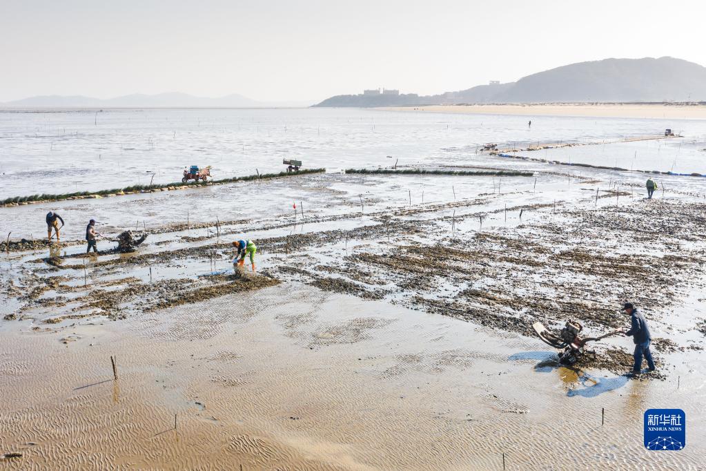 2月2日,福州瑯岐島漁民在翻耕灘涂播種蟶苗(無(wú)人機照片)。