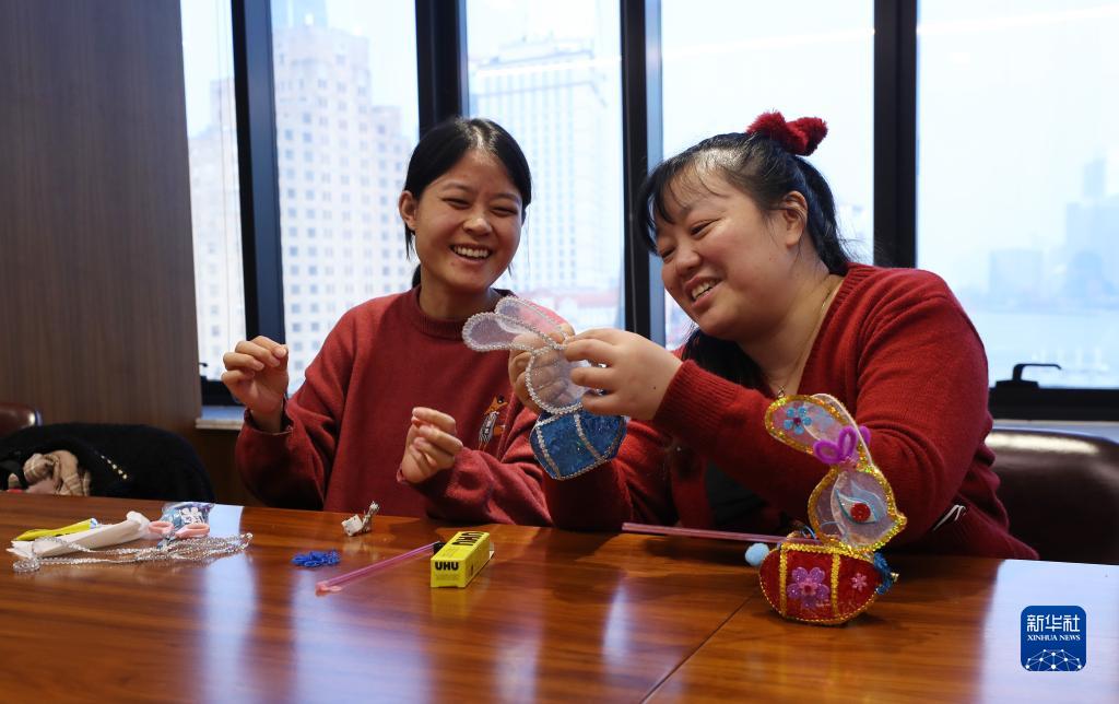 2月1日,龔智瑜(右)在上海外灘街道為社區企業(yè)職員講解兔子燈制作技法。