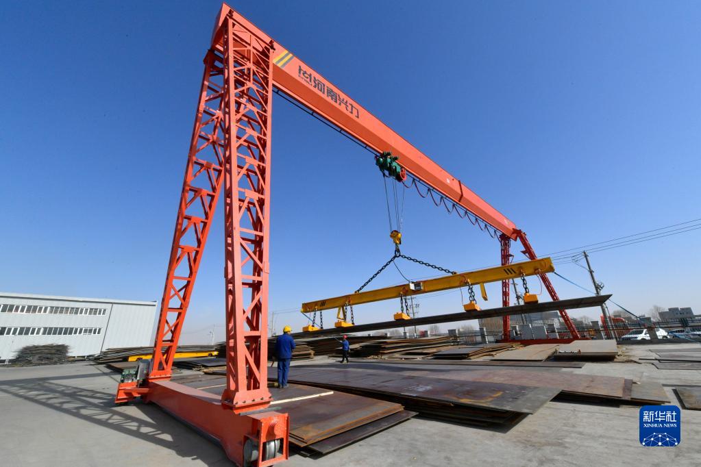 2月2日,在張掖市高臺縣的一家風(fēng)機塔筒企業(yè),工人使用龍門(mén)吊車(chē)吊運鋼板。