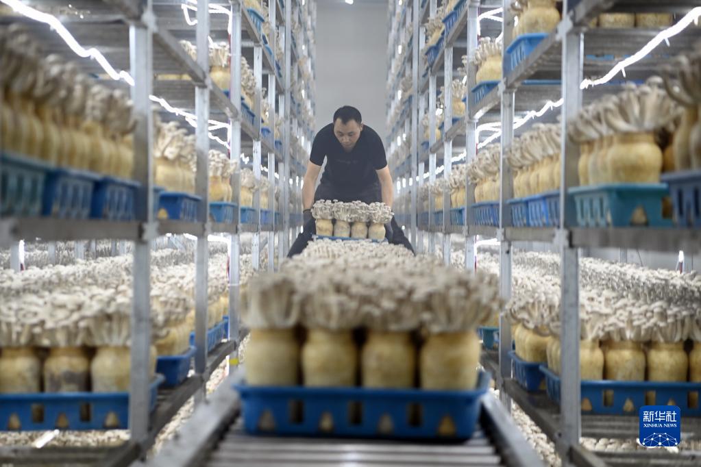 在張掖市甘州區的一家食用菌企業(yè),工作人員搬運成熟的鹿茸菇(2月1日攝)。