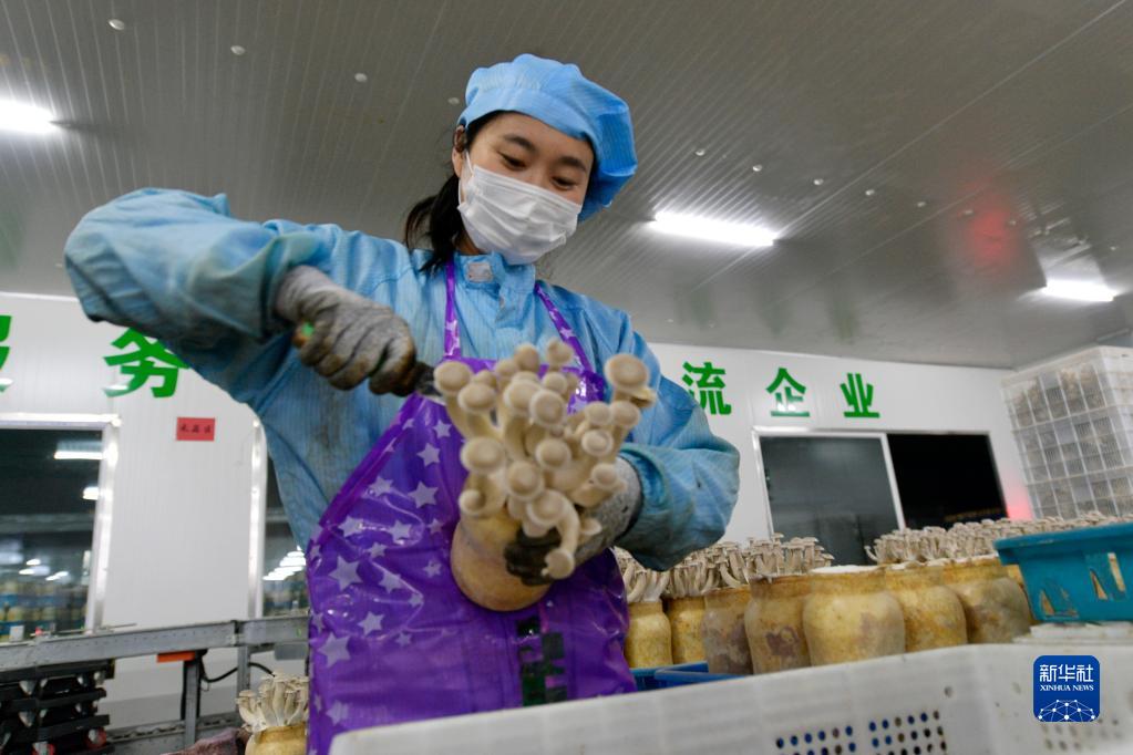 在張掖市甘州區的一家食用菌企業(yè),工作人員采收成熟的鹿茸菇(2月1日攝)。