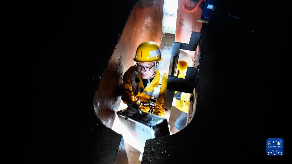 2月2日,一名橋梁工在墩頂檢查口傳遞檢查工具。