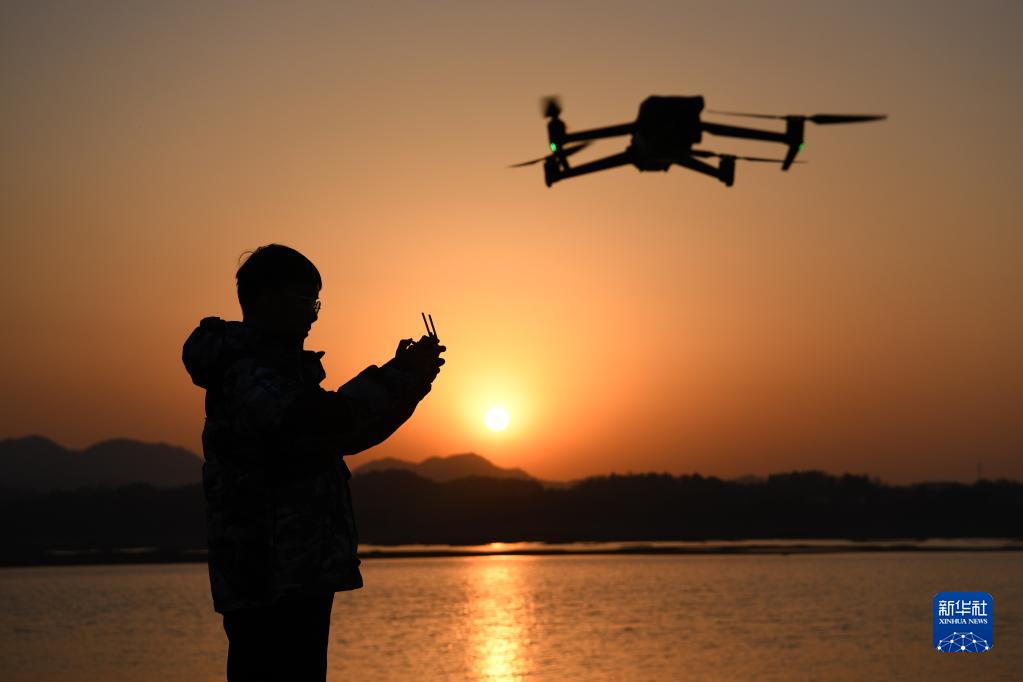 1月30日,郭昊在安徽省六安市舒城縣湯池鎮三江碼頭進(jìn)行無(wú)人機航拍。
