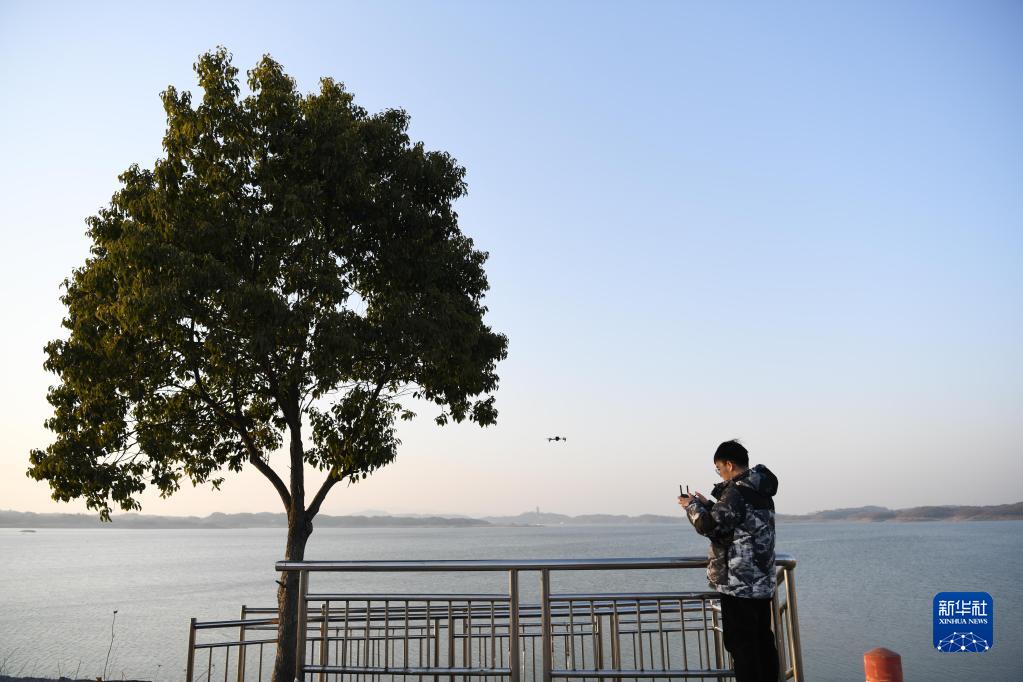 1月30日,郭昊在安徽省六安市舒城縣湯池鎮三江碼頭進(jìn)行無(wú)人機航拍。