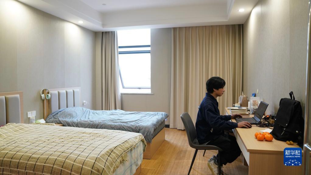 江西國軒新能源科技有限公司實(shí)習員工周詩(shī)航在公司的宿舍內上網(wǎng)(2月2日攝)。