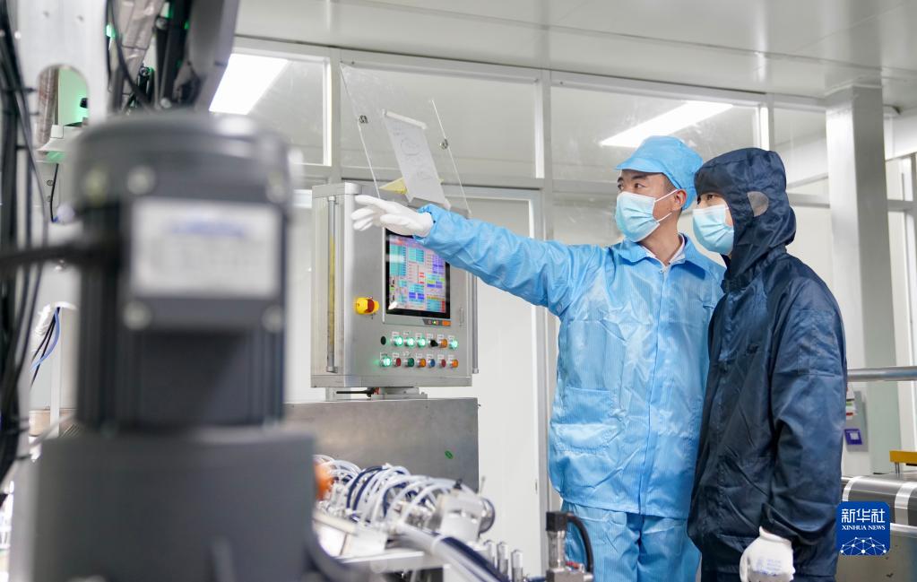 江西國軒新能源科技有限公司實(shí)習員工周詩(shī)航(右)在其他同事的指導下學(xué)習涂布工序模頭的操作方法(2月2日攝)。
