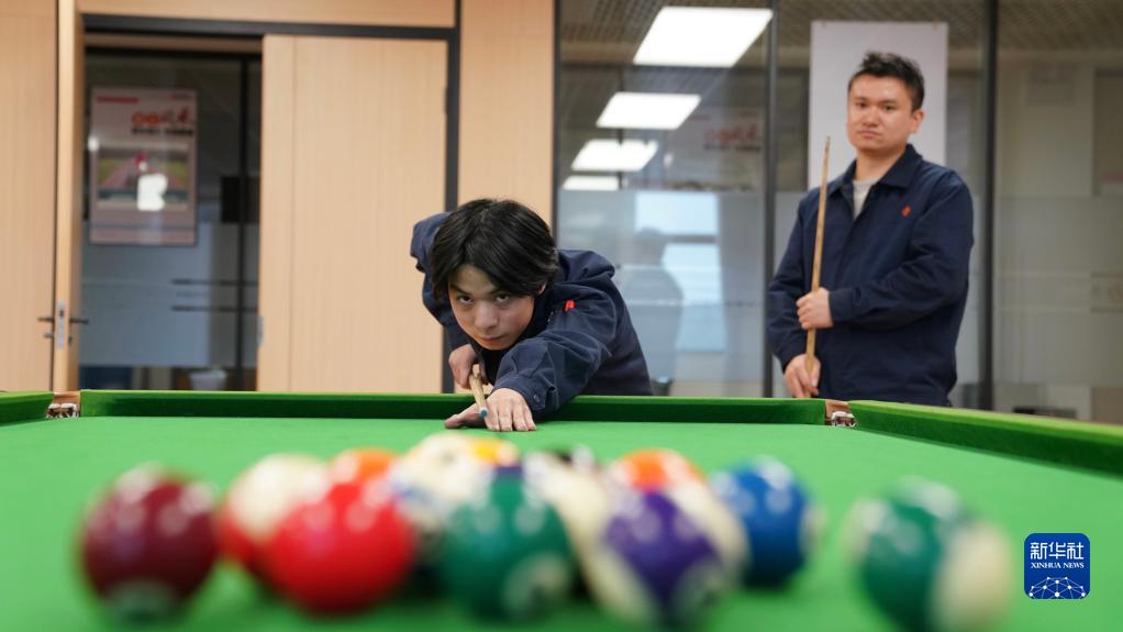 江西國軒新能源科技有限公司實(shí)習員工周詩(shī)航在公司的休息室內和同事一起打桌球(2月2日攝)。