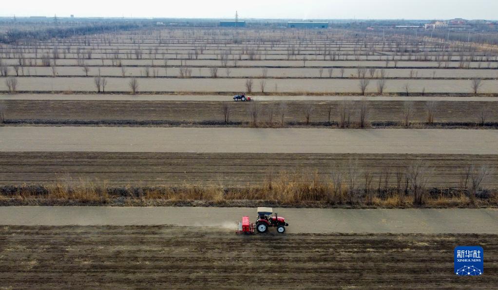 2月2日,工人在位于天津市靜海區蔡公莊鎮的天津市農業(yè)科學(xué)院農作物研究所示范基地操作機器播種春小麥原種(無(wú)人機照片)。