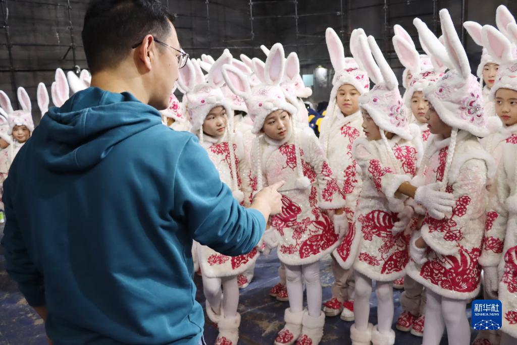馬蘭花兒童聲合唱團聲樂(lè )老師王金山(前)指導孩子們排練(1月18日攝)。