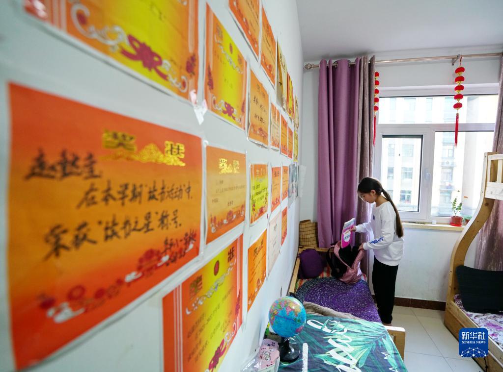在河北省保定市阜平縣,馬蘭花兒童聲合唱團團員趙懿萱在房間內整理書(shū)包(1月29日攝)。