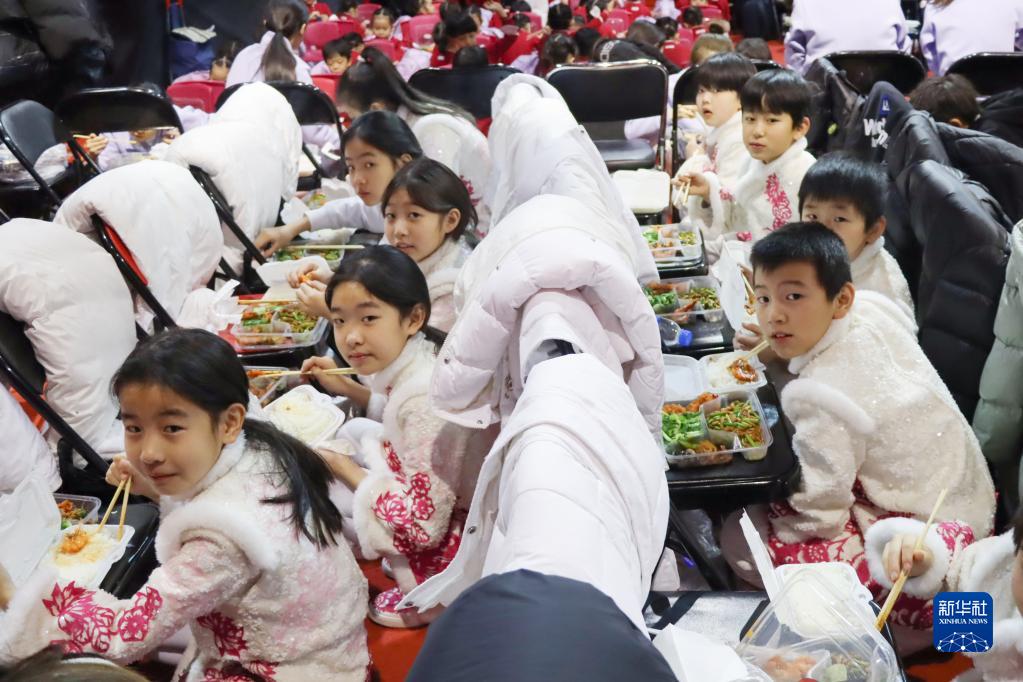 馬蘭花兒童聲合唱團團員在春晚彩排的備場(chǎng)室吃午飯(1月18日攝)。