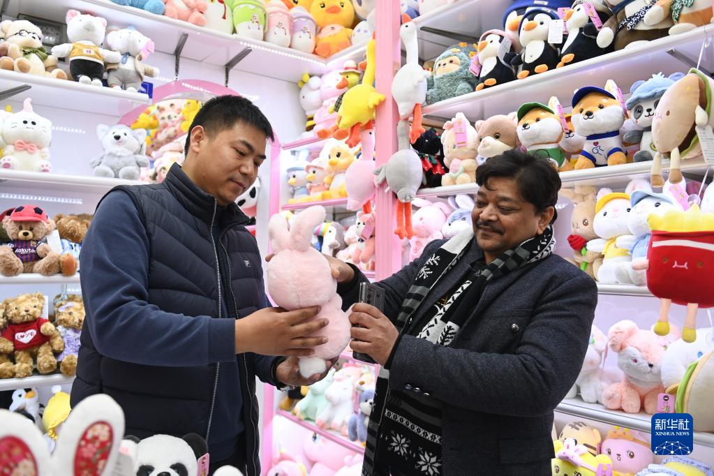 來(lái)自印度的客商拉賈(右)在義烏國際商貿城的一家玩具店鋪內選購(2月2日攝)。