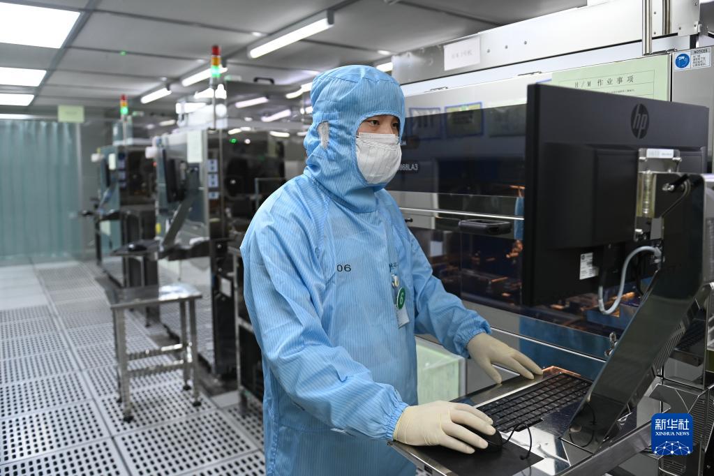 工人在寧波金晟芯影像技術(shù)有限公司無(wú)塵車(chē)間操作攝像頭模組生產(chǎn)設備(2月1日攝)。