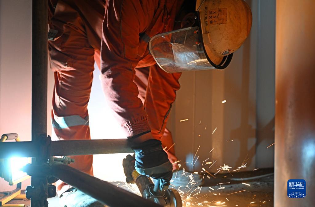 2月2日,工人在海油工程塘沽建造場(chǎng)地進(jìn)行切割作業(yè)。