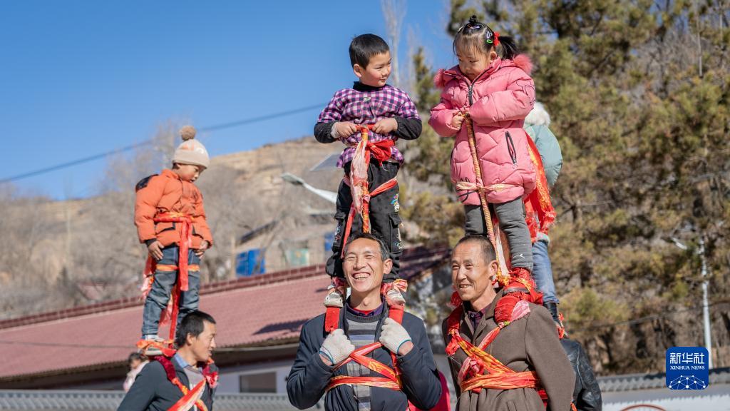 2月3日,寧夏固原市隆德縣觀(guān)莊鄉陽(yáng)洼村村民在排練扛社火??干缁鹗怯缮韽娏训某赡昴凶蛹缈钙鹉挲g較小的孩子,扮演成各種不同的戲曲人物,在行走中進(jìn)行表演,是社火演出的一種形式。