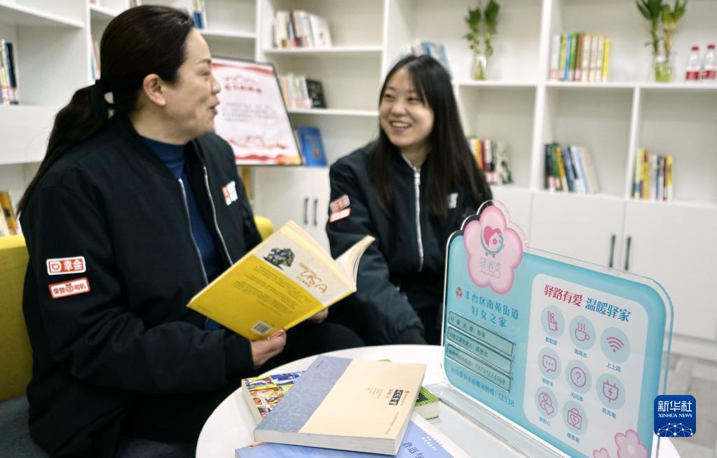 2月2日,從事網(wǎng)約車(chē)工作的張金梅(左)在豐臺區南苑街道黨群服務(wù)中心的“驛港灣”和同事看書(shū)聊天。