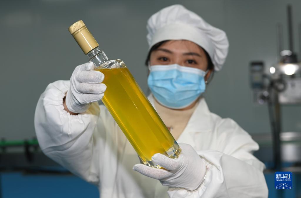 2月3日,在貴州玉屏侗族自治縣油茶基地的油茶加工企業(yè),工人在生產(chǎn)車(chē)間展示剛生產(chǎn)的茶油。