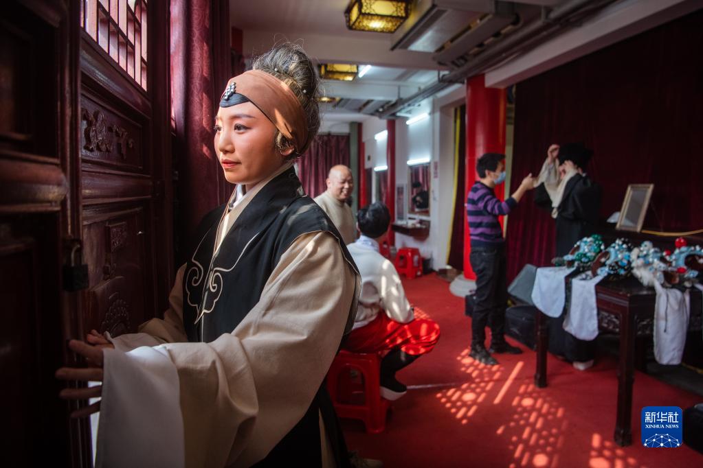2月3日,武漢楚劇院演員在后臺候場(chǎng)。